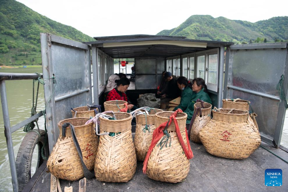 HUANGSHAN, 27 abril, 2026 (Xinhua) -- Imagen del 24 de abril de 2026 de recolectores tomando un bote para regresar a la aldea de Houkeng, en el distrito de Huangshan de la ciudad de Huangshan, en la provincia de Anhui, en el este de China. El Taiping Houkui es un famoso té verde de Anhui, conocido por sus hojas planas y alargadas. Ofrece un aroma único, un sabor suave y un regusto dulce. (Xinhua/Zhang Duan)