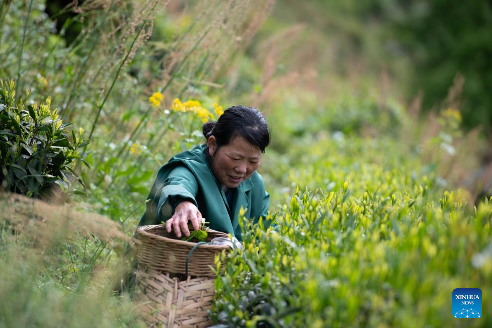 HUANGSHAN, 27 abril, 2026 (Xinhua) -- Imagen del 24 de abril de 2026 de una recolectora de té recogiendo hojas de té en un jardín de té en la montaña, en la aldea de Houkeng, en el distrito de Huangshan de la ciudad de Huangshan, en la provincia de Anhui, en el este de China. El Taiping Houkui es un famoso té verde de Anhui, conocido por sus hojas planas y alargadas. Ofrece un aroma único, un sabor suave y un regusto dulce. (Xinhua/Zhang Duan)