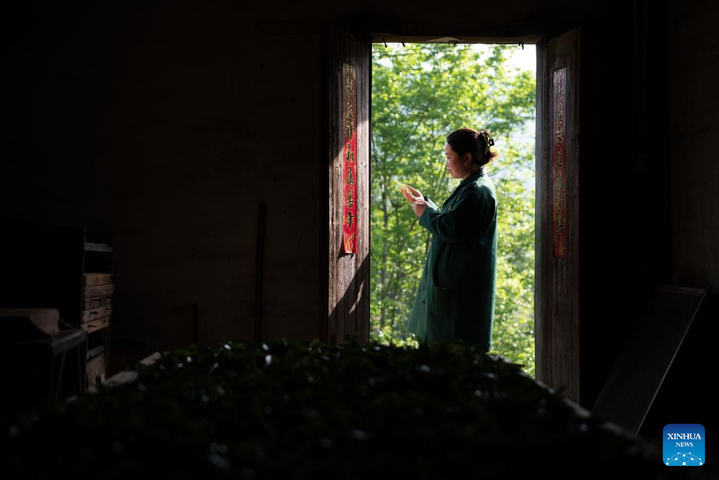 HUANGSHAN, 27 abril, 2026 (Xinhua) -- Imagen del 25 de abril de 2026 de una agricultora de té revisando la calidad de las hojas de té, en la aldea de Houkeng, en el distrito de Huangshan de la ciudad de Huangshan, en la provincia de Anhui, en el este de China. El Taiping Houkui es un famoso té verde de Anhui, conocido por sus hojas planas y alargadas. Ofrece un aroma único, un sabor suave y un regusto dulce. (Xinhua/Zhang Duan)