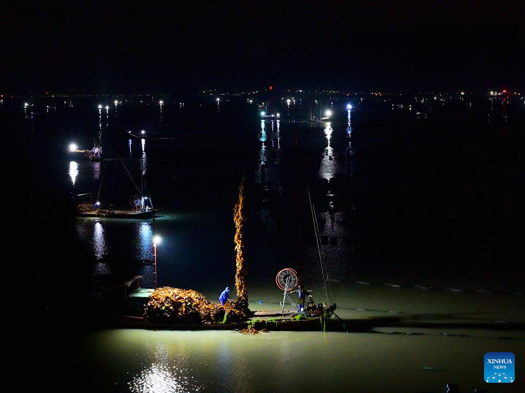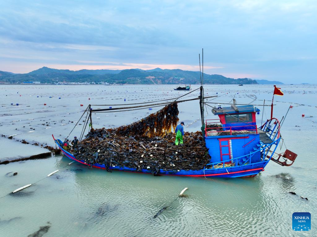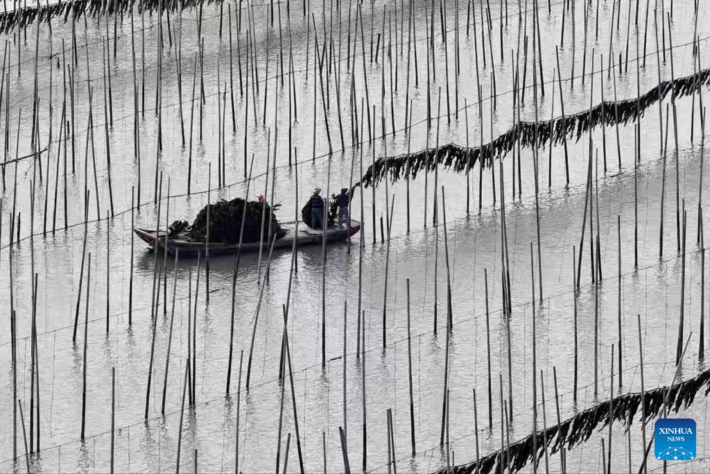 XIAPU, 28 abril, 2026 (Xinhua) -- Imagen del 26 de abril de 2026 de pescadores cosechando algas marinas, en el poblado de Shajiang del distrito de Xiapu, en la ciudad de Ningde, en la provincia de Fujian, en el sureste de China. El distrito de Xiapu, una de las principales áreas de producción de algas marinas de China, ha entrado en su temporada alta de cosecha. (Xinhua/Chen Weibin)