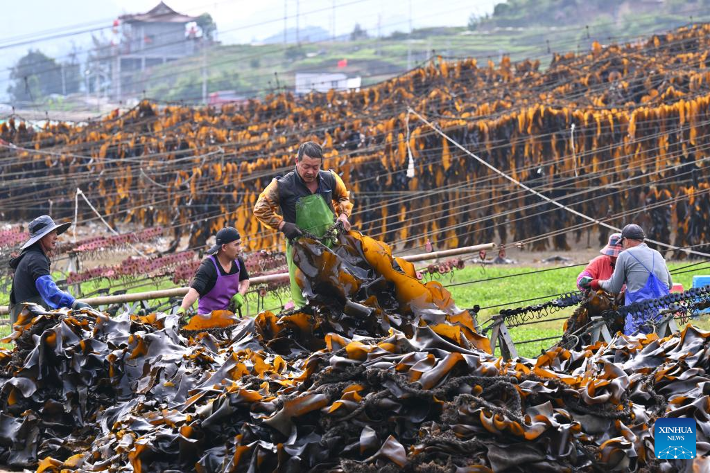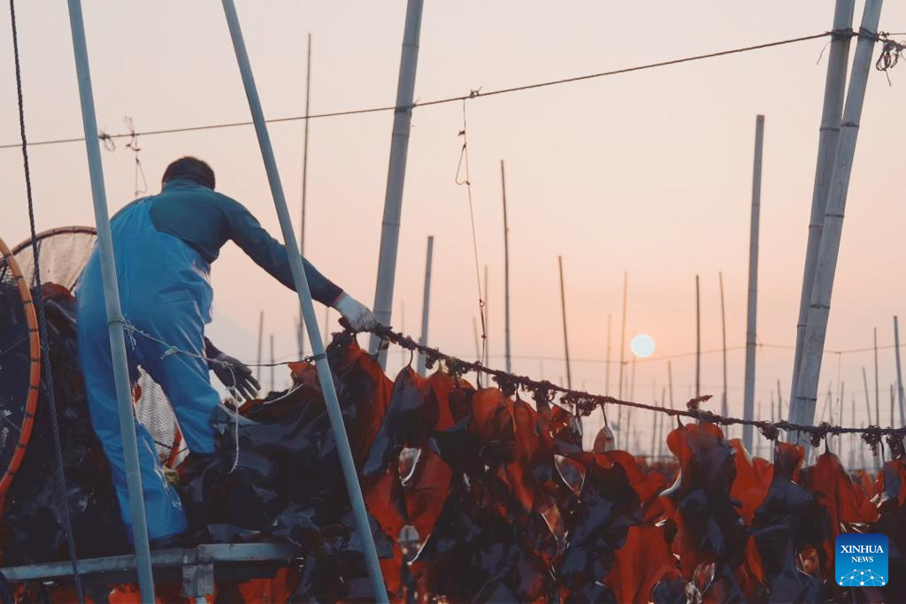 XIAPU, 28 abril, 2026 (Xinhua) -- Imagen del 25 de abril de 2026 de pescadores colgando algas marinas en cuerdas para secarlas, en el poblado de Xiahu del distrito de Xiapu, en la ciudad de Ningde, en la provincia de Fujian, en el sureste de China. El distrito de Xiapu, una de las principales áreas de producción de algas marinas de China, ha entrado en su temporada alta de cosecha. (Xinhua/Jiang Kehong)