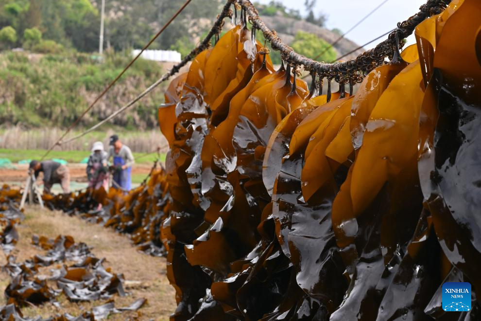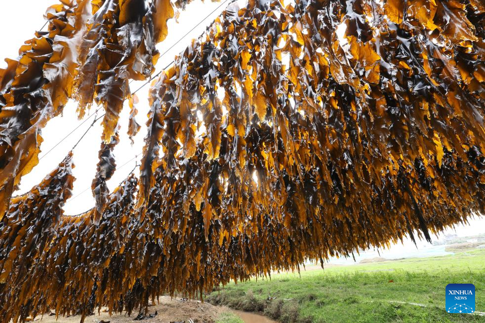 XIAPU, 28 abril, 2026 (Xinhua) -- Imagen del 25 de abril de 2026 de algas marinas colgadas en cuerdas para secarse, en el poblado de Xiahu del distrito de Xiapu, en la ciudad de Ningde, en la provincia de Fujian, en el sureste de China. El distrito de Xiapu, una de las principales áreas de producción de algas marinas de China, ha entrado en su temporada alta de cosecha. (Xinhua/Jiang Kehong)