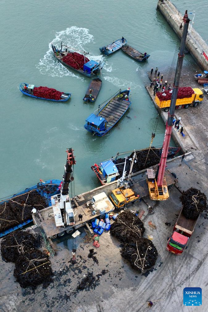 XIAPU, 28 abril, 2026 (Xinhua) -- Imagen tomada con un dron el 25 de abril de 2026 de pescadores transportando algas marinas en un muelle, en el poblado de Xiahu del distrito de Xiapu, en la ciudad de Ningde, en la provincia de Fujian, en el sureste de China. El distrito de Xiapu, una de las principales áreas de producción de algas marinas de China, ha entrado en su temporada alta de cosecha. (Xinhua/Jiang Kehong)