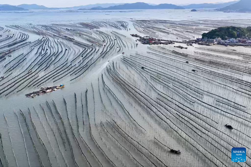 XIAPU, 28 abril, 2026 (Xinhua) -- Imagen tomada con un dron el 25 de abril de 2026 de pescadores cosechando algas marinas, en el poblado de Xiahu del distrito de Xiapu, en la ciudad de Ningde, en la provincia de Fujian, en el sureste de China. El distrito de Xiapu, una de las principales áreas de producción de algas marinas de China, ha entrado en su temporada alta de cosecha. (Xinhua/Jiang Kehong)