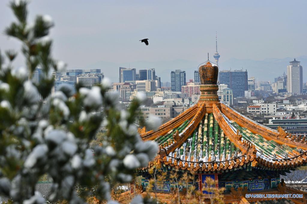 BEIJING, 19 marzo, 2022 (Xinhua) -- Imagen del 19 de marzo de 2022 del paisaje nevado en el parque Jingshan en Beijing, capital de China. (Xinhua/Song Weiwei)