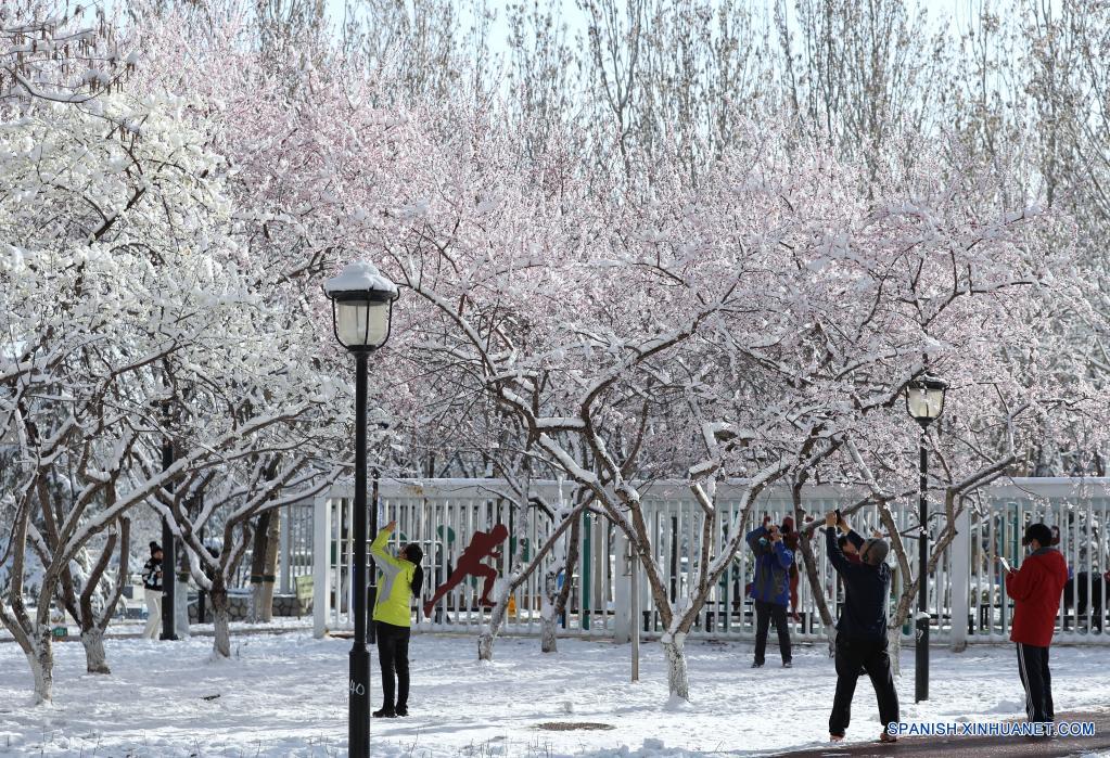 BEIJING, 19 marzo, 2022 (Xinhua) -- Personas toman fotografías del paisaje nevado, en el distrito de Daxing de Beijing, capital de China, el 19 de marzo de 2022. (Xinhua/Cheng Tingting)